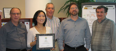 Members of the Code Council’s SMARTcodes team show off their Celebration of Engineering and Technology (CETI) Award. From left‚ Jeff Wix‚ AEC3 Ltd.; Code Council Special Projects Coordinator Eunice Lee; Code Council Senior Advisor David Conover; Richard See‚ Digital Alchemy; and Nick Nisbet‚ AEC3 Ltd.