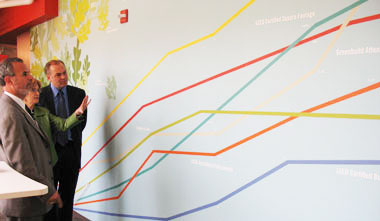USGBC Director of Education and Research Partnerships Linda Sorrento explains the USGBC history wall while giving Code Council Board President Steve Shapiro (left) and CEO Rick Weiland a tour of USGBC’s platinum-level LEED-certified offices.